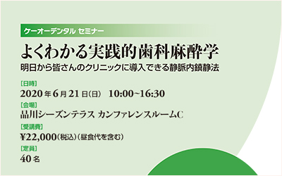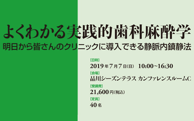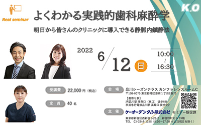 インプラントや歯周外科手術は歯科臨床におけるトピックスであり、天然歯の保存や咀嚼機能の回復を考えた時、積極的な外科処置の選択が可能な時代です。しかし、手術による不安や緊張、痛み、局所麻酔薬は生体にとってストレッサーとして働き、時には予想もしえない生体反応を示すことから、歯科治療に際した歯科麻酔学的配慮が必要とされます。 患者さんに、安全で快適な歯科医療を受けていただくには、1術前の診査・診断とリスクファクターの把握2適切な局所麻酔薬の選択3静脈内鎮静法の活用が大切となります。大学を卒業すると、なかなか学ぶことのできない「歯科麻酔学」を「実践的かつ臨床に即した形」で理解しながら、静脈路確保といった緊急時のスムーズな対応を「実習形式」で学習していただきます。そして明日から、皆さんのクリニックで歯科麻酔科医とのチームアプローチによる静脈内鎮静法を活用して、安全で快適な歯科医療を提供できるようになることが本セミナーの目的です。